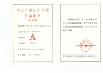 产品名称: 守合同重信用企业公示证书2013年度 |